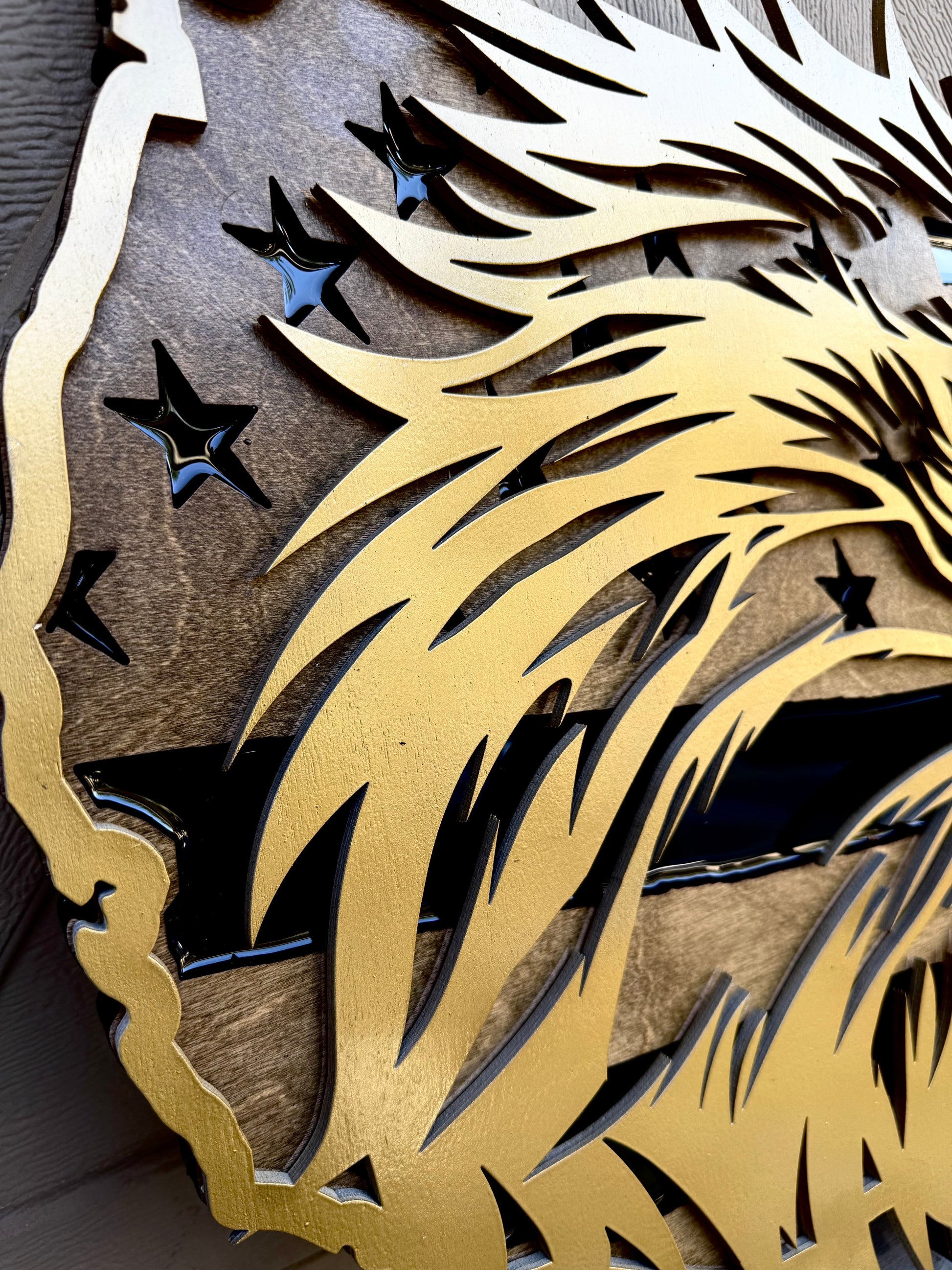 Show your American pride with this stunning 30" Tri-Layer Stained Birch Wood USA Wall Art featuring a golden painted majestic Bald Eagle and epoxy resin inlay. Handcrafted from high-quality birch plywood, this patriotic piece blends natural wood grain with precision laser-cut detailing to create a bold and dimensional tribute to the USA.