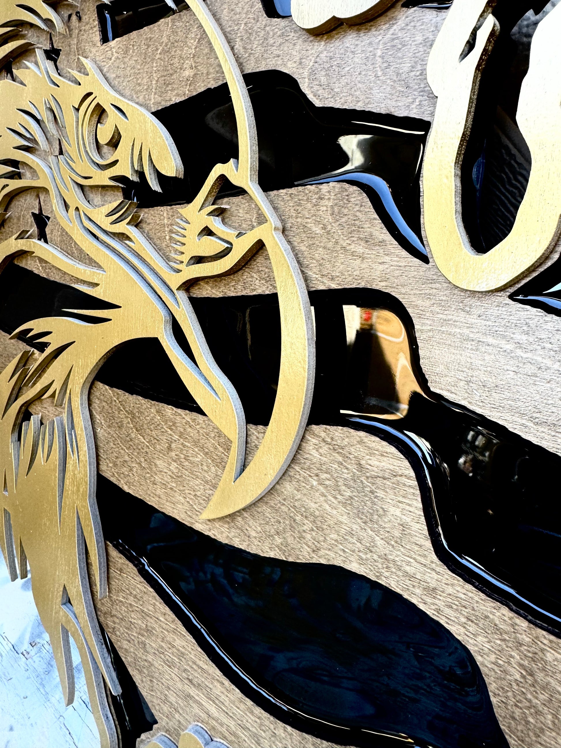 At the forefront, a beautifully detailed bald eagle—cut from wood and inlaid with durable, high-gloss epoxy resin—adds a powerful and symbolic touch. The layered design brings depth and texture, making this wall art a striking centerpiece in any room.