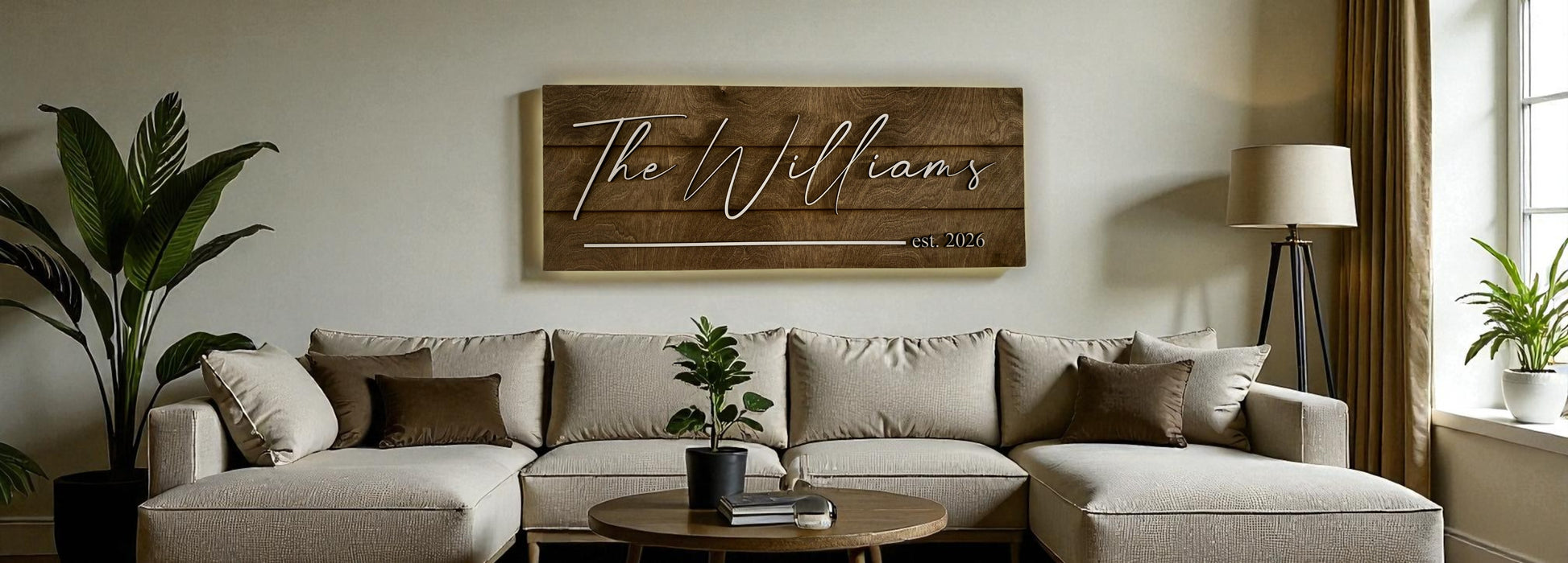 Bring a warm, sophisticated glow to your home with our custom back-lit family name signs, handcrafted from ¼” premium A1 maple and finished with a rich dark walnut stain. Each piece features elegant white overlay lettering, precision-cut and mounted for a clean, dimensional look.
