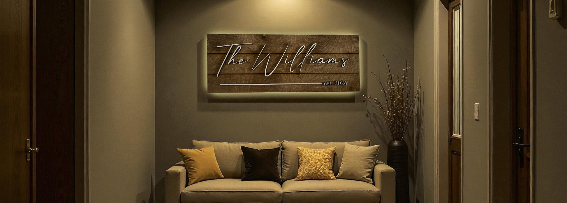 Built with integrated LED back-lighting, these signs create a soft ambient glow that highlights the natural wood grain and your personalized name — perfect for living rooms, entryways, or wedding gifts.